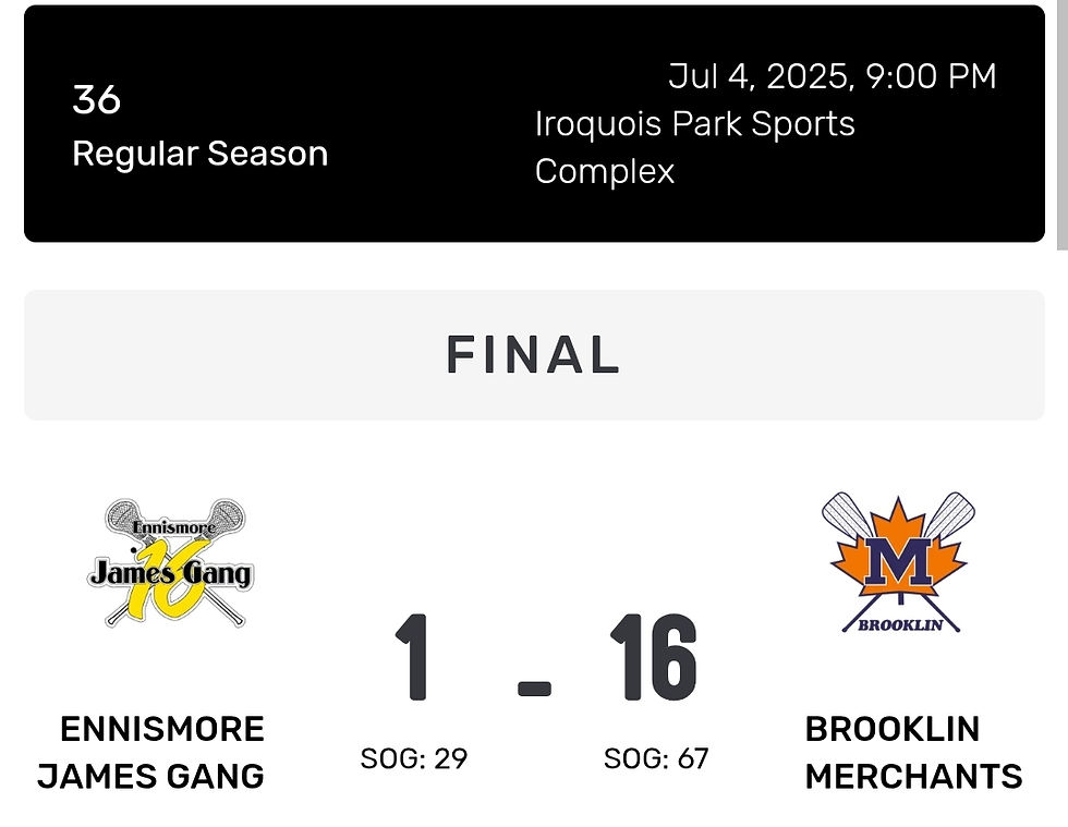 The Brooklin Merchants 25th anniversary season continues to be a glowing success. Other than a loss at the start of the season and one last week to the Six Nations Rivermen they now have an incredible 10-2 record with four regular season home games remaining. The run for first overall is within sight as they register each passing win. Last night they hosted the Ennismore James Gang in a Friday night showdown. The Merchants line-up featured a couple of recent additions in Braedon Saris (five goals) and Alex Marinier (four goals) and both provided an immediate dividend in a punishing 16-1 win over the James Gang.